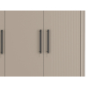 Модель укомплектована штангой и полками, что позволяет распределить разные категории одежды, убрав сезонные вещи и коробки наверх. Гладкие фасады украшены вертикальной фрезеровкой и лаконичными ручками-скобами. Скругленные углы обеспечивают безопасность при передвижении по комнате.