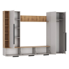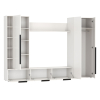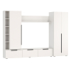 В конструкции всё продумано для рационального хранения одежды, декора, книг и прочих бытовых принадлежностей. Центральная ниша обеспечит место под телевизор большой диагонали и другие элементы мультимедийной системы. Сочетание глухих фасадов и открытых ниш создает визуально приятный и уютный интерьер. Узкие лаконичные ручки не перетягивают на себя внимание и поддерживают тренд на минимализм.